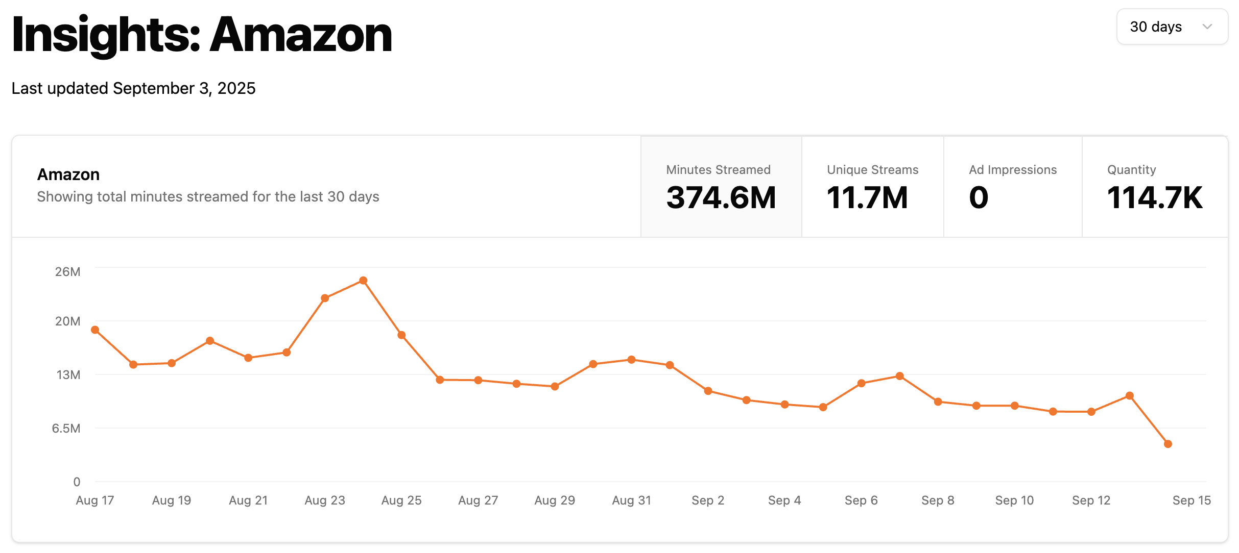 - Minutes streamed: How many minutes your content has been streamed. Reported multiple times per week.