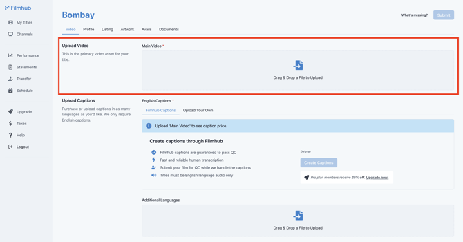 To upload the title’s Main Video file, you can either ‘Drag & Drop a File’ directly onto the dashboard.