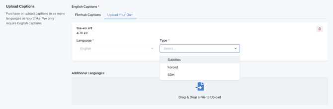 - Once your caption file is uploaded, use the dropdown menus to select the Language and Type.