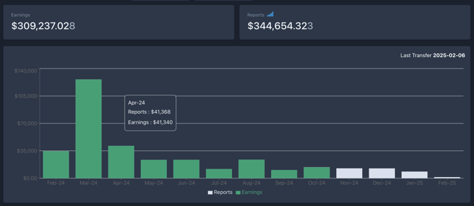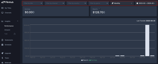 After your title goes live on a channel, your Performance Chart will regularly update with estimated net reports and earnings. Reports and Earnings are updated according to the Schedule.